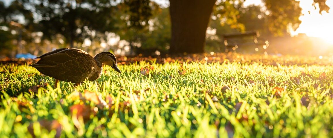 A beautiful shot of a cute mallard walking on a grass